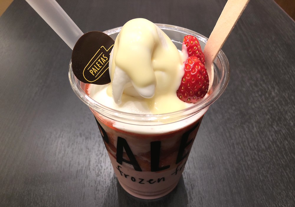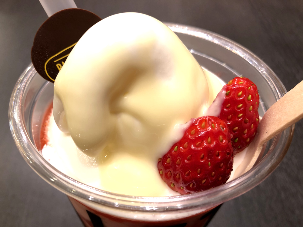 カップの表面には、スライスされたイチゴが張り付いていて、