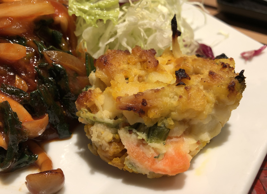 具だくさんのポテトサラダをグラタンのように焼いたものた付け合わせ。