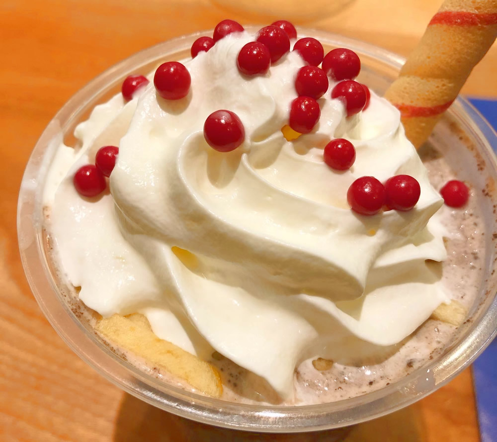 カウンターで、お姉さんに「クッキーのストロー」を手渡され、そこからもうテンションアップです!このクッキーストローは、ストローの内側にホワイトチョコレートコーティングかな?一応は水分に強い設計になっています!