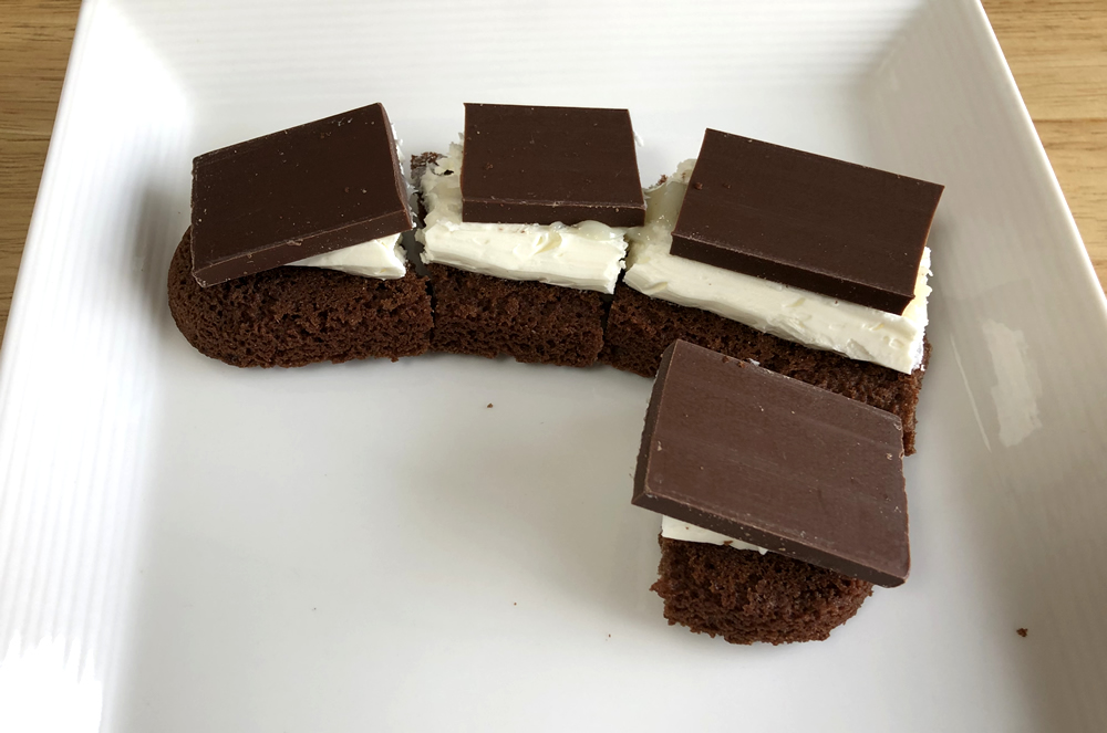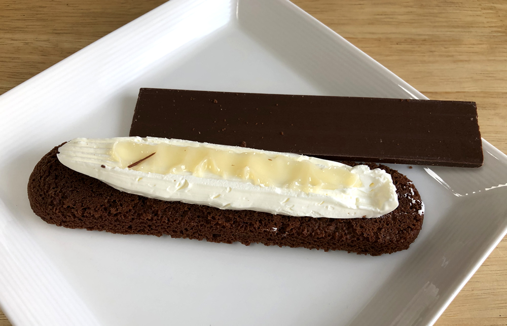 見た目は、クッキーの上に、クリーム、板チョコ。な感じ。
